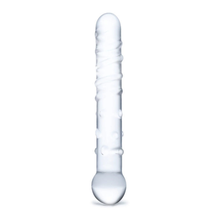 Dildo de verre droit et texturé avec deux extrémités modelées: une boule et une plus effilée.
