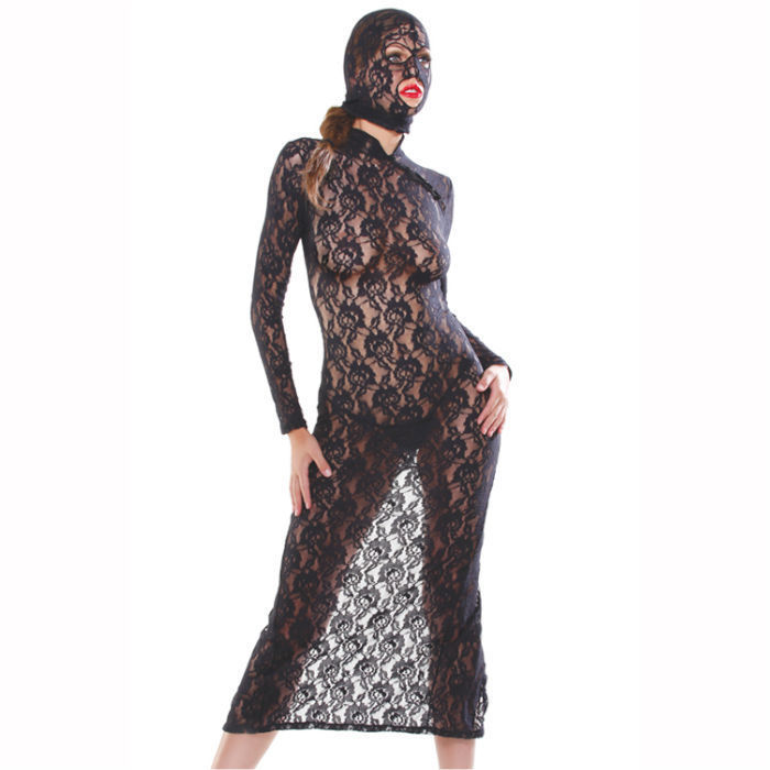 Une robe longue en dentelle moulante et extensible, ouverture prononcée à l'arrière.