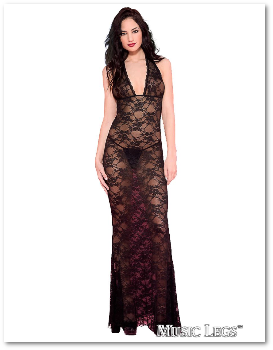 Robe longue ajustée en dentelle extensible transparente avec de hauts bonnets en triangles et une encolure licou nouée à l'arrière.