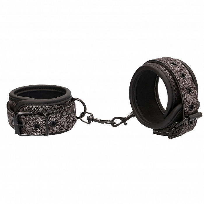 Fabriquées en cuir reconstitué, néoprène, PVC et métal, ces menottes de poignet gris titane font leur travail avec goût!!