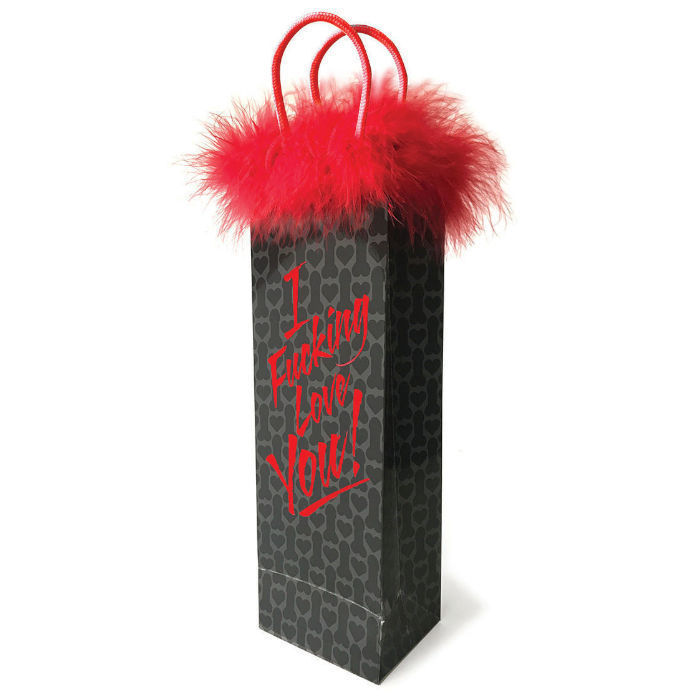 Ce sac ludique et suggestif avec un tampon sexy en feuille rouge déclare : « I Fucking Love You ! » orné de plumes de marabout rouges moelleuses, ce ravissant sac est aussi amusant à offrir qu'à recevoir.