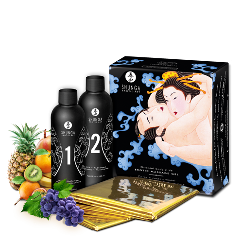 Le massage oriental corps à corps se traduit en une expérience sensuelle totalement amusante où les corps, presqu’en état d’apesanteur, glissent allègrement l’un contre l’autre dans un mouvement de va-et-vient. La gelée, versée en grande quantité sur deux corps nus, crée un effet enivrant et aphrodisiaque. Rends la peau soyeuse et transforme les caresses en touchers sensuels. 2 bouteilles de 225ml (7.6 fl. Oz) La bouteille 1 contient l’arôme, la bouteille 2 contient l’activateur.